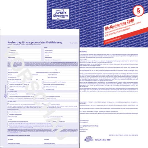 Der Kfz-Kaufvertrag 2880 von AVERY ZWECKFORM im DIN-A4-Format bietet eine sichere und rechtlich geprüfte Grundlage für den Kauf oder Verkauf von Fahrzeugen zwischen Privatpersonen. Er ermöglicht eine reibungslose und transparente Abwicklung und berücksichtigt alle relevanten Angaben rund um Fahrzeug, Zustand und Zahlungsmodalitäten.
