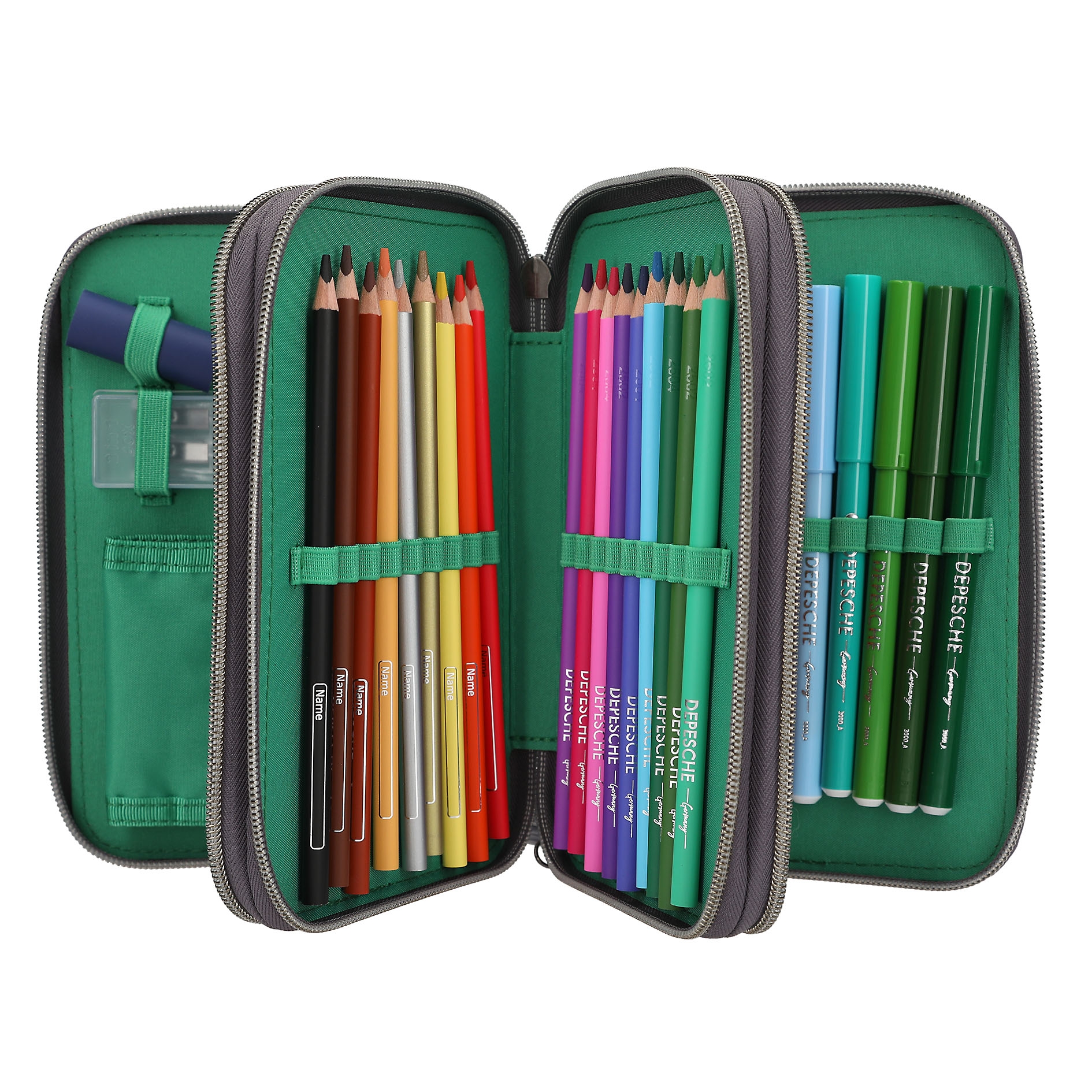 Die Federtasche ist in drei separaten Fächern organisiert und bereits komplett gefüllt: Bunt- und Filzstifte, Bleistifte, Anspitzer, Radierer, Lineal, Schere, Klebestift und ein kleines Klett-Täschchen sind mit dabei. So ist man bestens ausgerüstet für Schule und Freizeit.