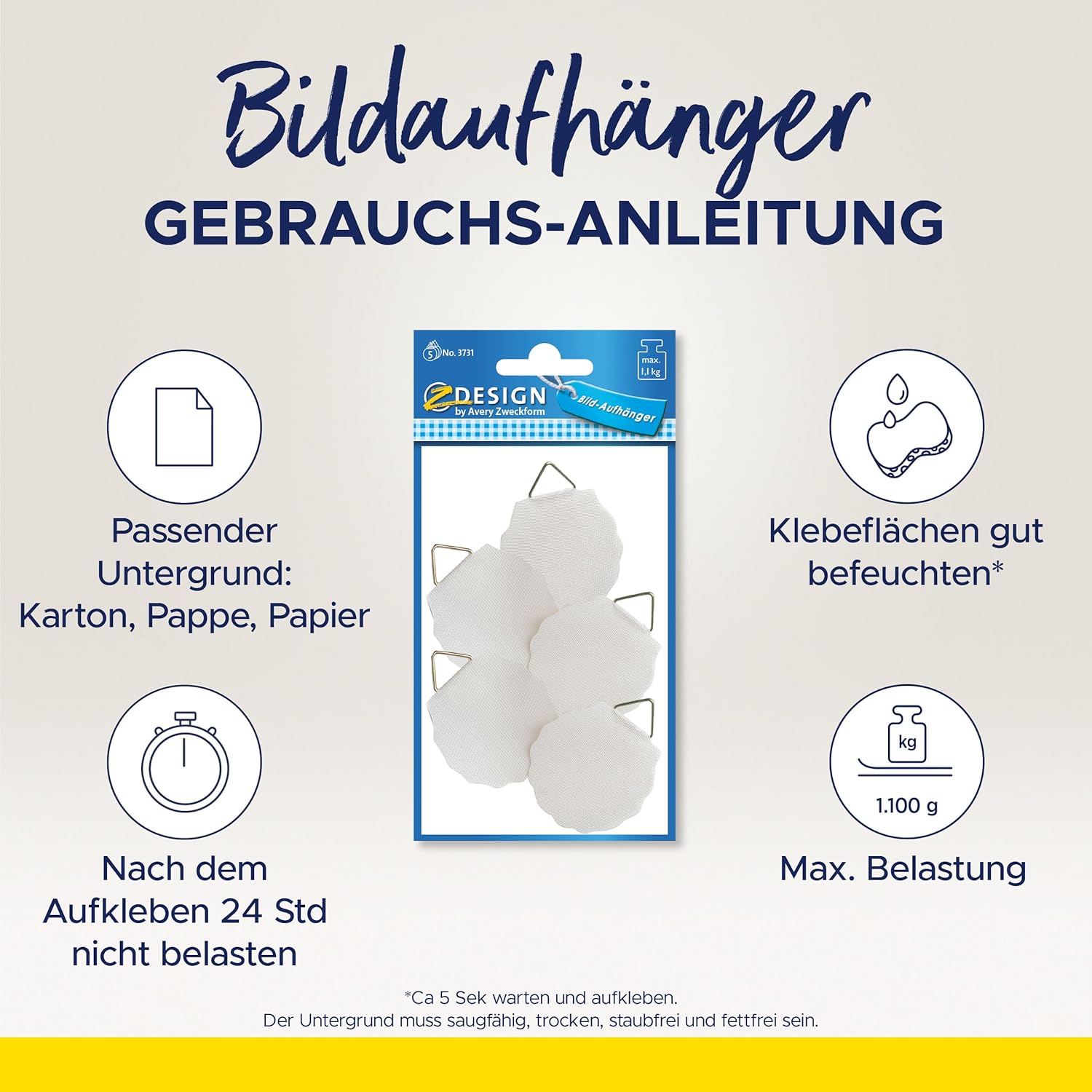 Die Avery Zweckform Bildaufhänger 3731 sind die praktische und saubere Lösung zum Aufhängen von Bildern und Dekorationen, ganz ohne Bohren. Die 5 weißen, selbstklebenden Aufhänger aus stabilem Leinengewebe mit integriertem Drahtbügel-Haken bieten dauerhafte Haftung und sind mit einem Maximalgewicht von 1.100 g belastbar – ideal für Poster, Fotos, Kalender, Schilder, Plakate oder kleine Rahmen.
