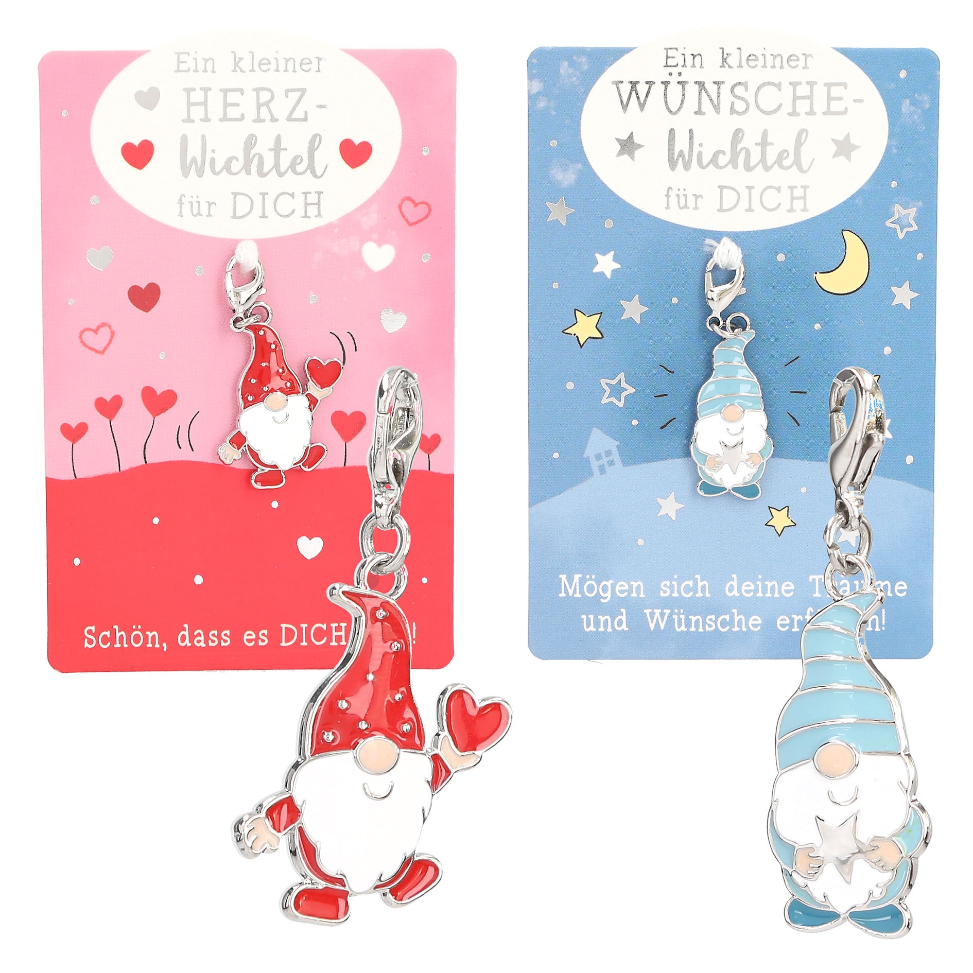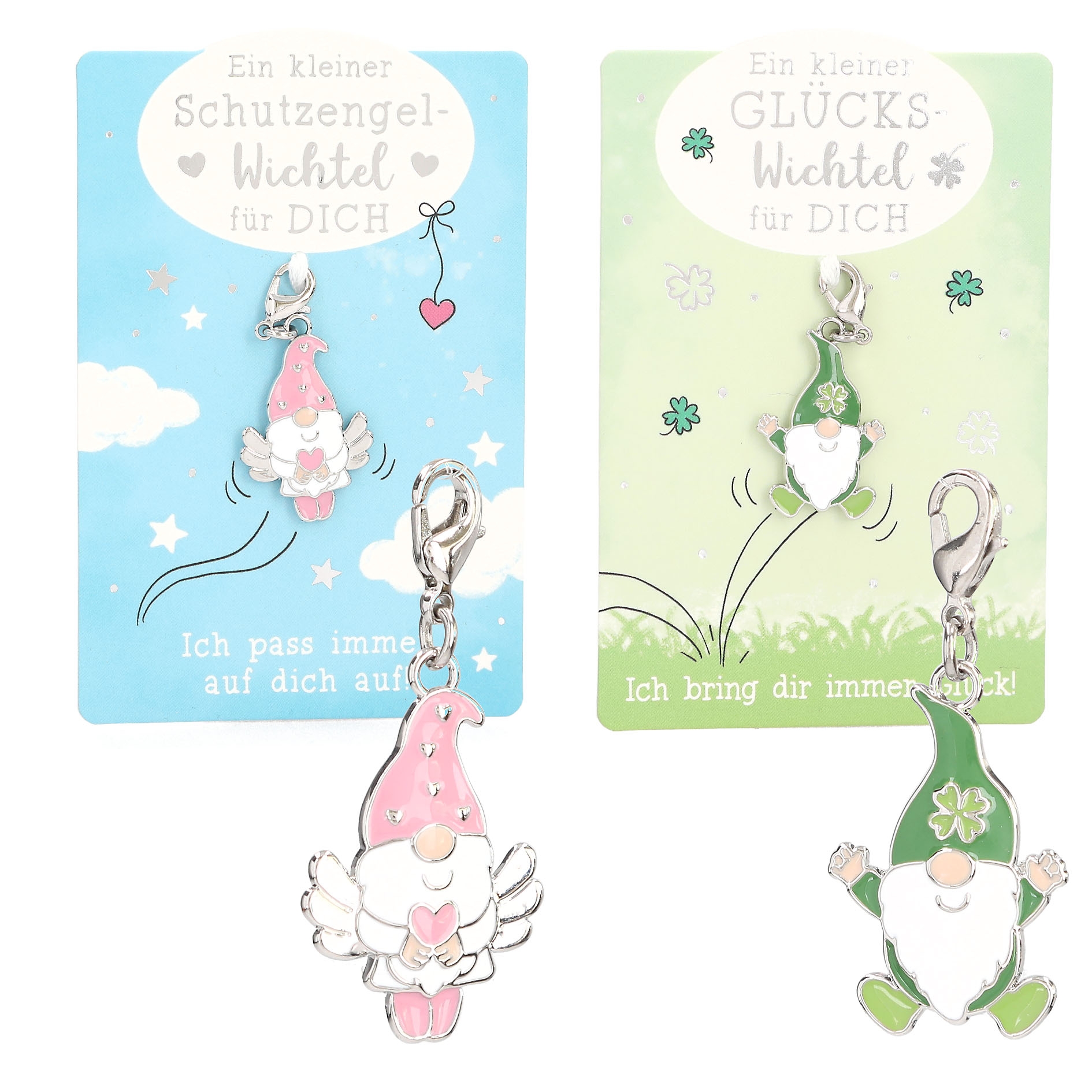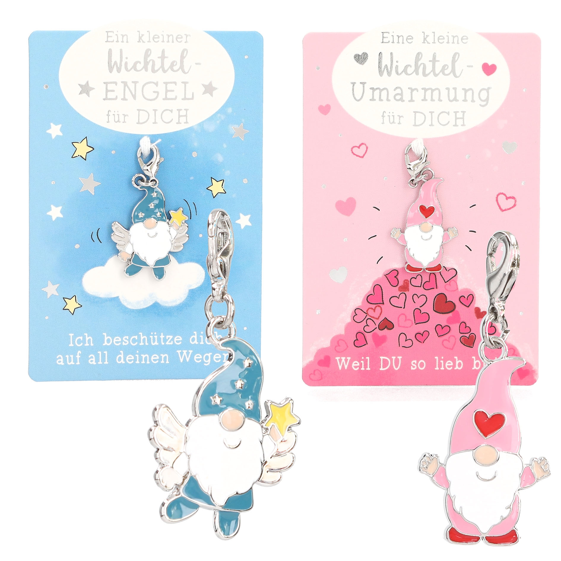 Die kleinen Wichtelanhänger begeistern mit sechs unterschiedlichen Designs in verschiedenen Farben und sind jeweils auf einer Karte mit einer herzlichen Botschaft befestigt. Die Themen reichen von Liebe, Glück und Wünschen bis hin zu Schutz, wodurch jeder Anhänger eine persönliche Bedeutung erhält.