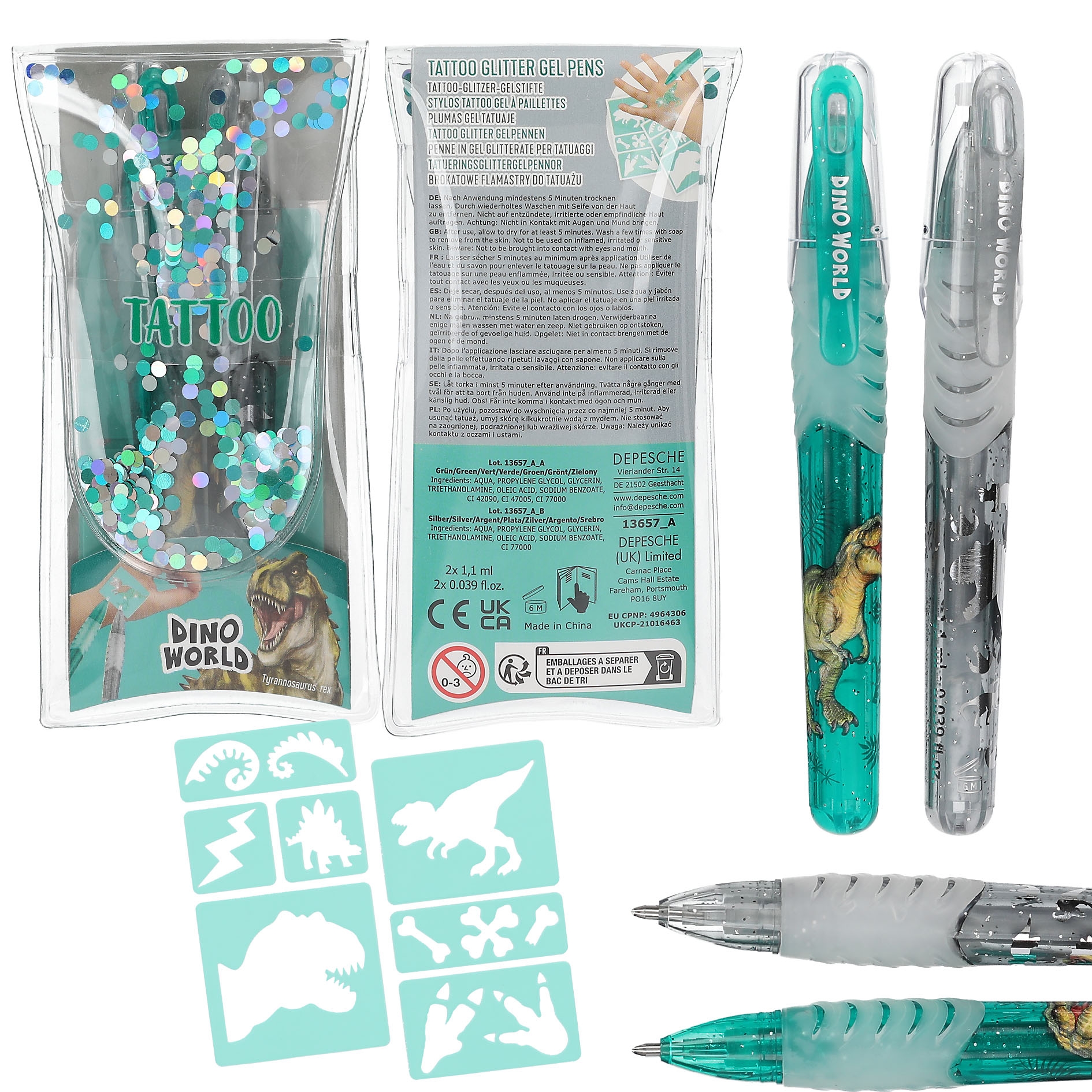 Dino World Tattoo Glitzer Gelstifte, grün/grau