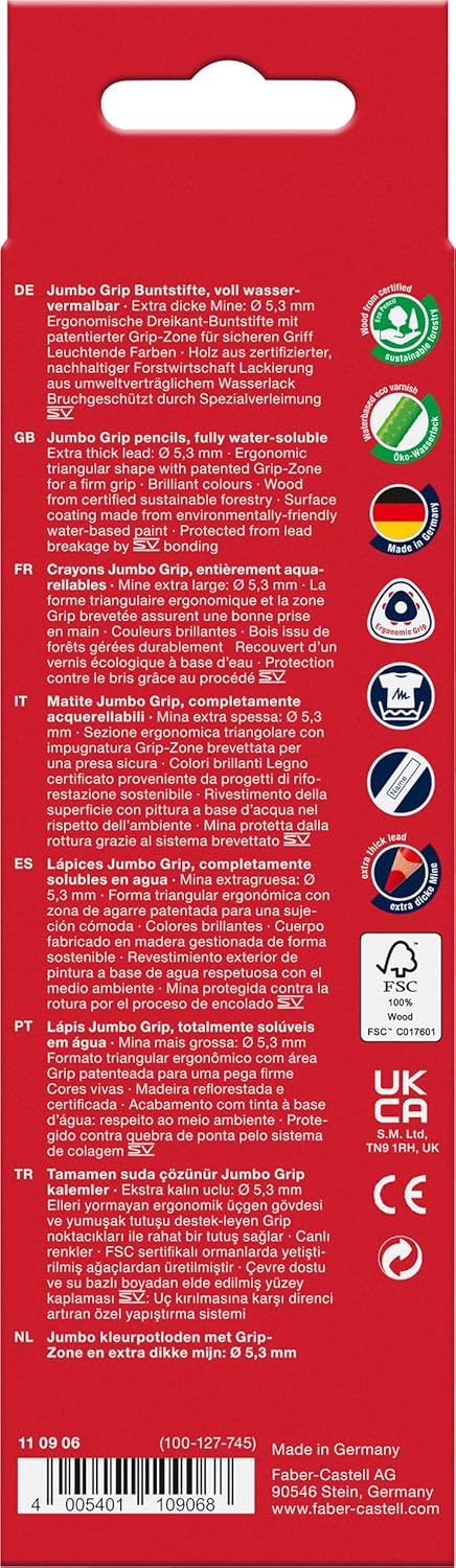 Die Faber-Castell Jumbo Grip Buntstifte sind ideal für kleine Kinderhände und sorgen mit ihrer extra dicken Form und der patentierten Soft-Grip-Zone für ein entspanntes und sicheres Malerlebnis. Die leuchtenden Farben sind vollständig wasservermalbar und regen zu kreativem Gestalten an – perfekt für Kindergarten, Schule und Zuhause.