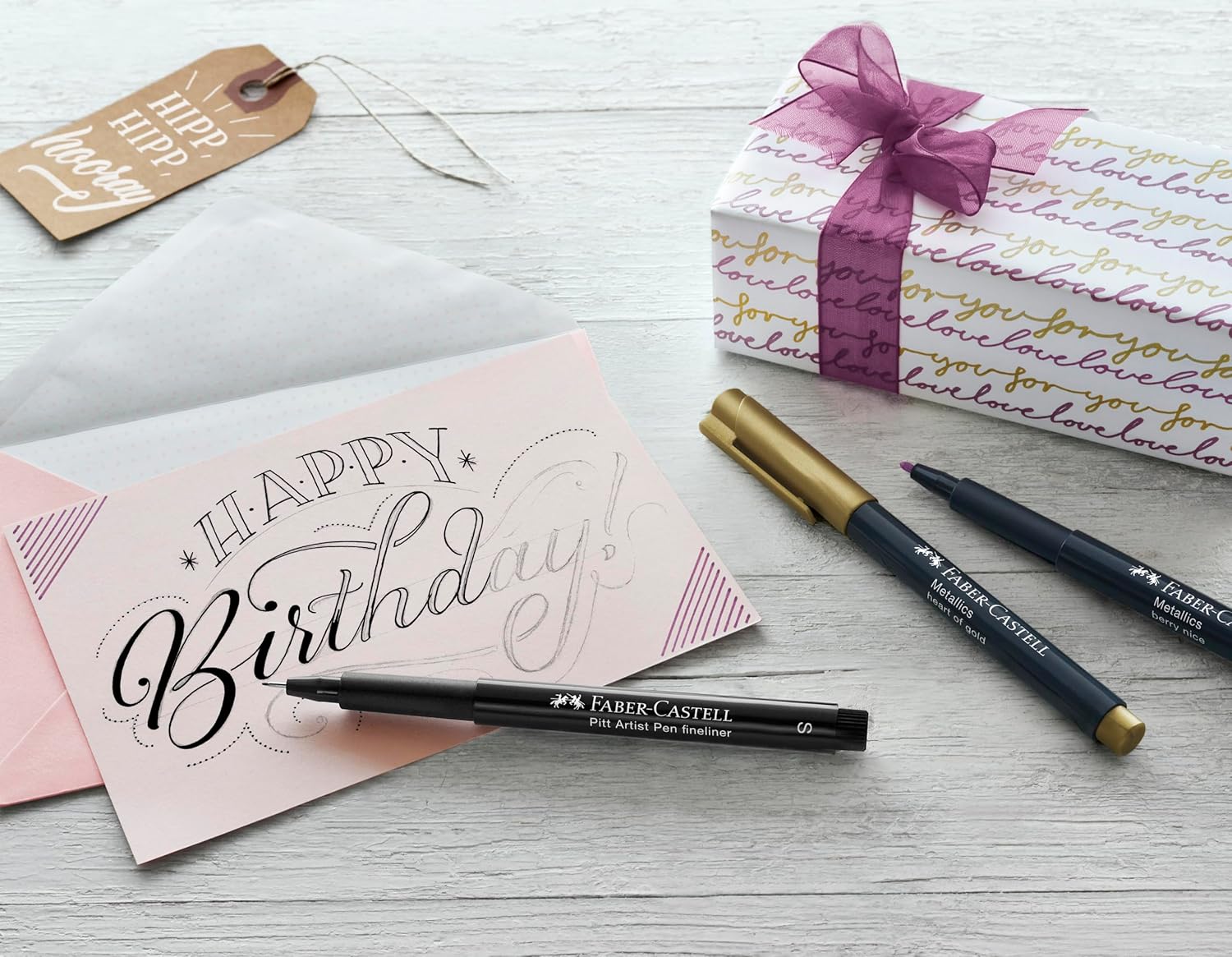 Ob geschwungene Letterings, kalligrafische Zitate oder kunstvolle Grußkarten – mit den verschiedenen Spitzen (Calligraphyspitze C 2,5 mm, Pinselspitze B und Fineliner S 0,3 mm) gelingen feine Linien ebenso wie ausdrucksstarke Schriftzüge.
