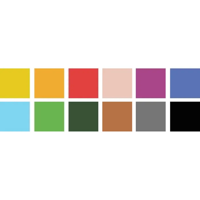 Kadmiumgelb, Chromgelb dunkel, Geraniumrot hell, Beigerot, Karmoisin, Kobaltblau, Lichtblau, Grasgrün, Permanent Oliv, Ocker gebrannt, Warmgrau IV, Schwarz