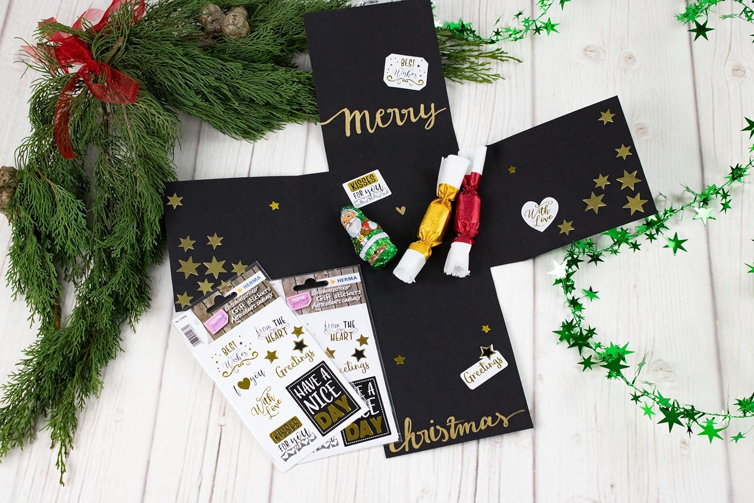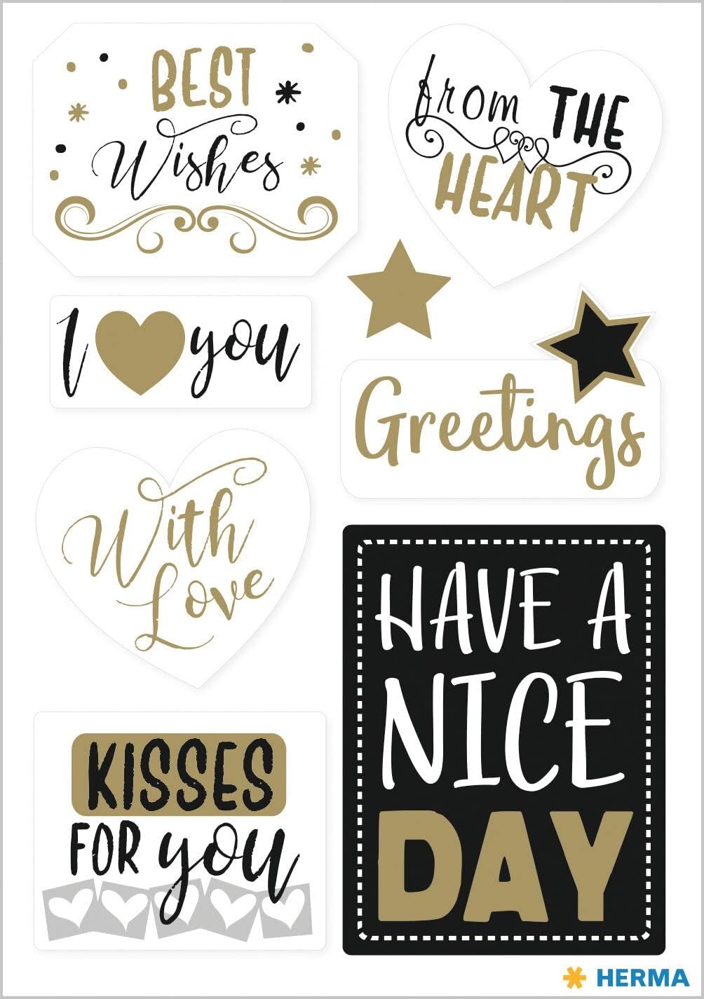 Die HERMA Geschenk Sticker – Best Wishes sind mit edler Goldfolie verziert und setzen stilvolle Highlights auf Geschenke, Grußkarten, Briefe, Fotoalben oder DIY-Dekorationen. Mit ihrem hochwertigen Druck und den festlichen Motiven eignen sie sich perfekt zum Verzieren, Basteln und Gestalten.