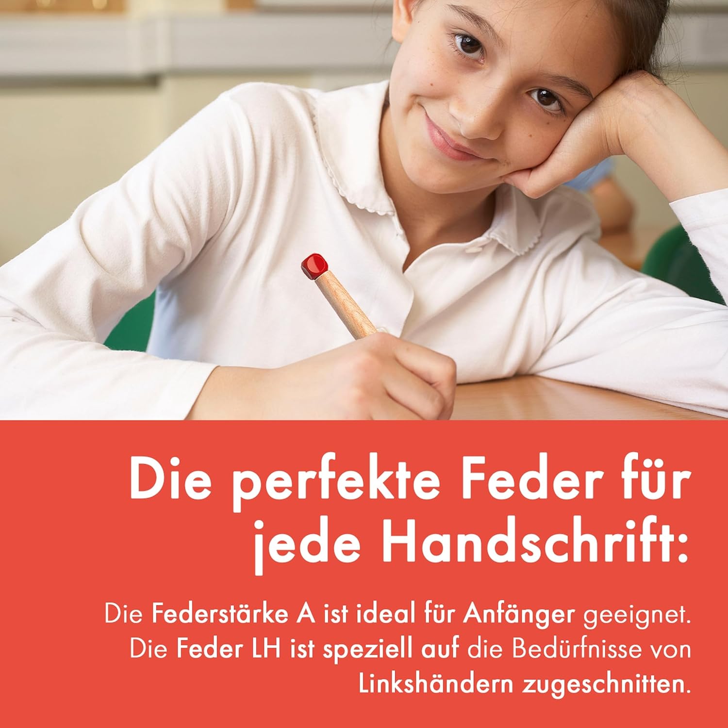 ERGONOMISCH & KINDGERECHT: Das rutschfeste, ergonomische Griffstück fördert die richtige Fingerhaltung und trainiert die Feinmotorik. Die polierte Edelstahlfeder gleitet sanft über das Papier und sorgt für ein gleichmäßiges Schriftbild – ohne Kleckse oder Kratzen.