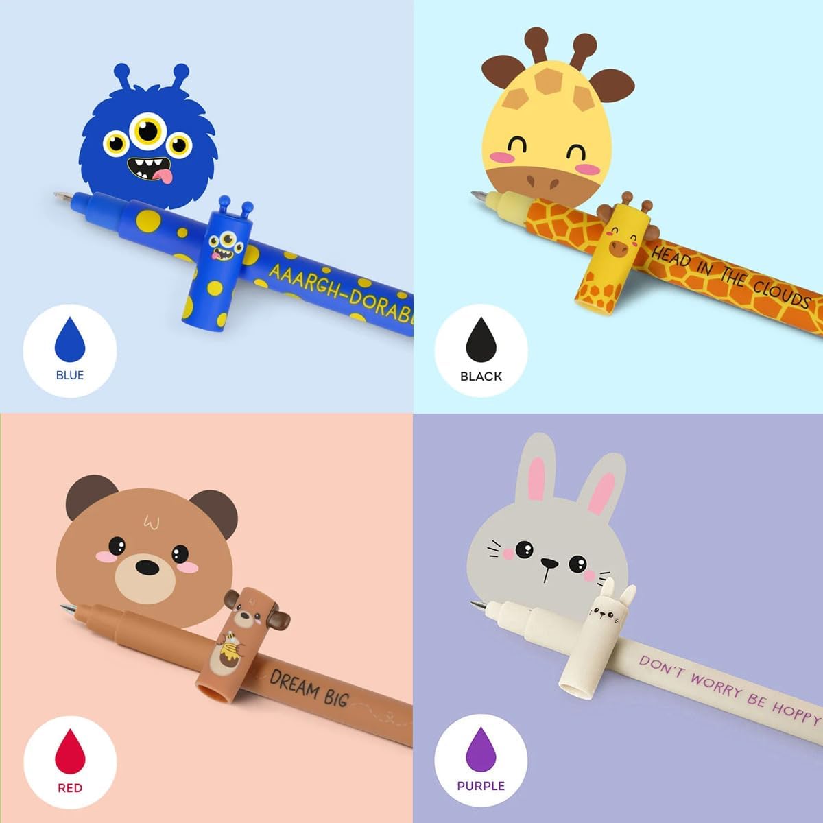 Legami 7er-Set löschbare Gelstifte - Hai, Giraffe, Hase, Marienkäfer, Monster, Lama, Teddy