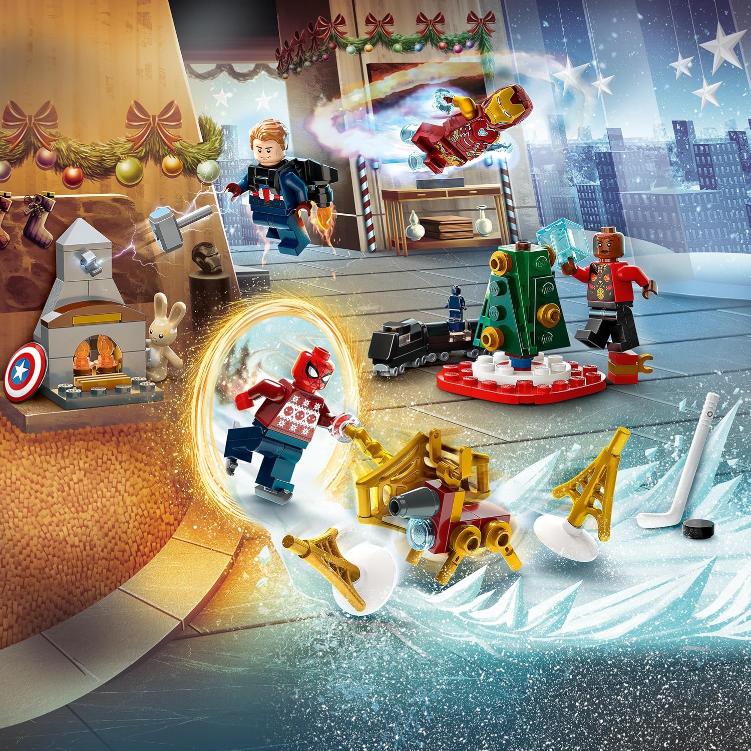 Der Kalender enthält 7 detailgetreue Minifiguren aus dem Marvel Cinematic Universe: Doctor Strange, Captain America, Spider-Man, Iron Man, Okoye, Wong und Black Widow. Ergänzt wird das Set durch kultige Mini-Modelle wie den Hydra-Zug, einen Quinjet, ein Jetpack und viele weitere Zubehörteile wie ein Eishockey-Set – alles inspiriert von unvergesslichen Filmszenen.