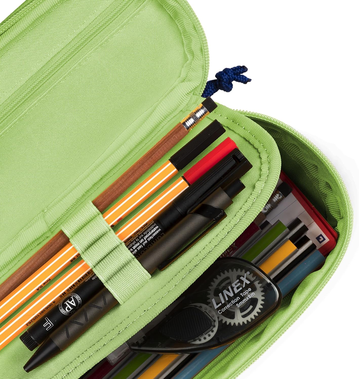 Das Mäppchen steht selbst randvoll stabil und sicher, während das farblich abgestimmte Gummiband eine einfache Befestigung an Collegeblöcken, Ringbüchern oder Ordnern ermöglicht. Hergestellt aus robustem, wasserabweisendem Polyester, ist es perfekt für den täglichen Gebrauch geeignet.