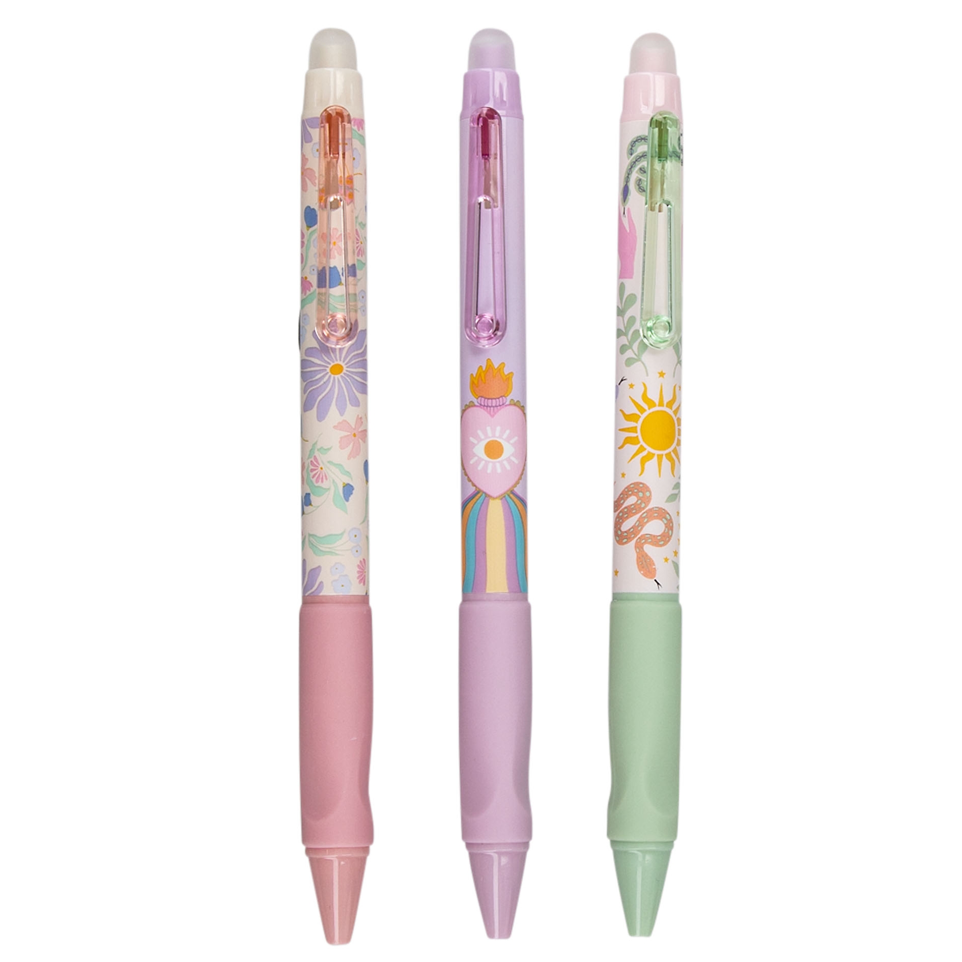 Dank des Soft-Touch-Griffs liegt der Stift besonders bequem in der Hand. Die 0,7 mm Mine sorgt für ein gleichmäßiges Schriftbild – ideal für Schule, Büro oder kreative Notizen. Erhältlich in drei pastelligen Designs mit fantasievollen Mustern: Rosa, Lila und Grün.