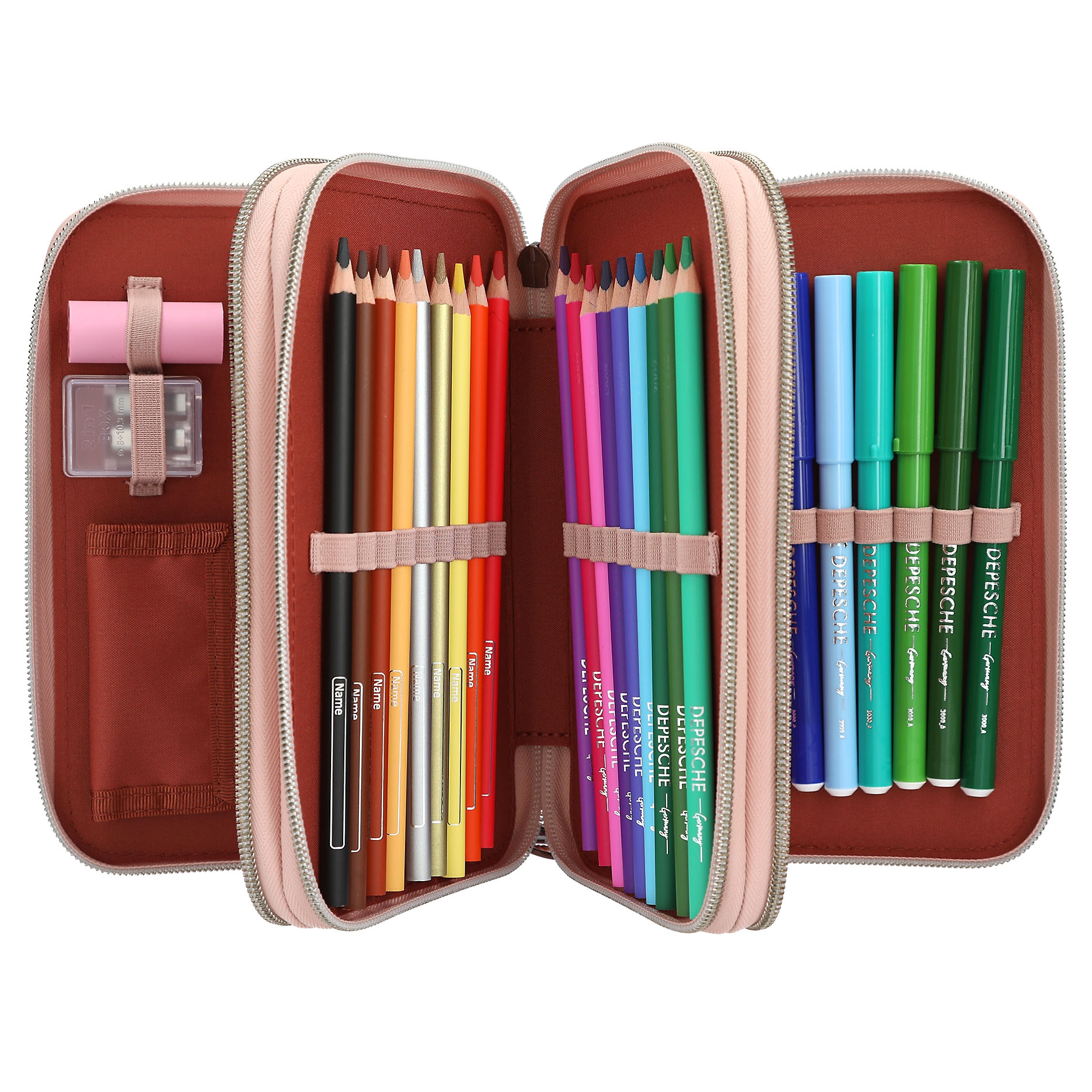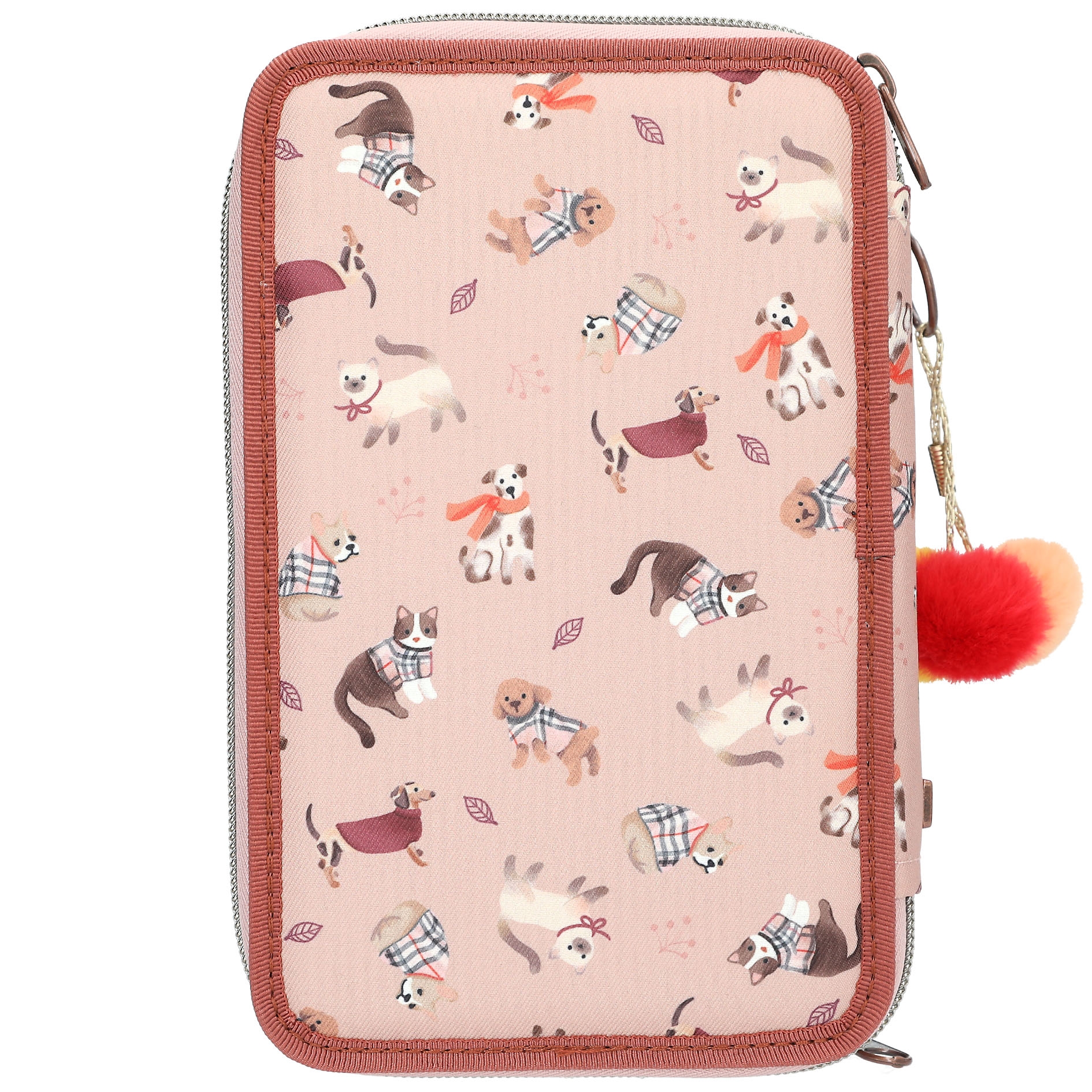 Tierisch süß und bestens organisiert: Die komplett gefüllte 3-Fach-Federtasche aus der TOPModel Designlinie FUR EVER FRIENDS überzeugt mit einem liebevollen Design in pudrigem Rosa und schimmerndem Kupfer. Auf der Vorderseite ist ein großes Motiv mit TOPModel-Charme abgebildet, die Seiten zieren ein Allover aus niedlichen Hunden und Katzen. Ein besonderer Hingucker ist der Reißverschlussanhänger mit drei farbenfrohen Bommeln. In den drei separaten Fächern findet sich alles, was kleine Künstler und Schülerinnen brauchen – ideal für Schule und Freizeit.