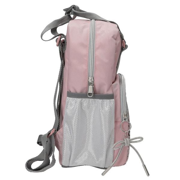 Die verstellbaren Schultergurte sorgen für optimalen Tragekomfort, während die beiden oberen Griffe sich per Druckknopf verbinden lassen. Im Inneren bietet der Rucksack einen klappbaren Boden für mehr Stabilität. Die seitlichen Mesh-Taschen aus glitzerndem Material eignen sich ideal für Trinkflaschen oder kleine Accessoires.