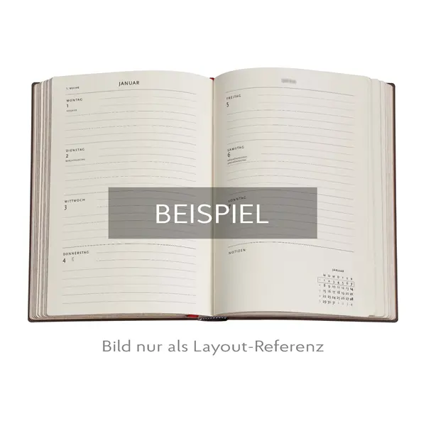 • Layout: Woche auf zwei Seiten (links Wochentage, rechts Notizen)